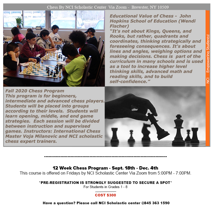 This 12-week Online Chess Program Starts On Sept. 18th, 2020 (Cost $300). To Register, Please Click On The Link Below.