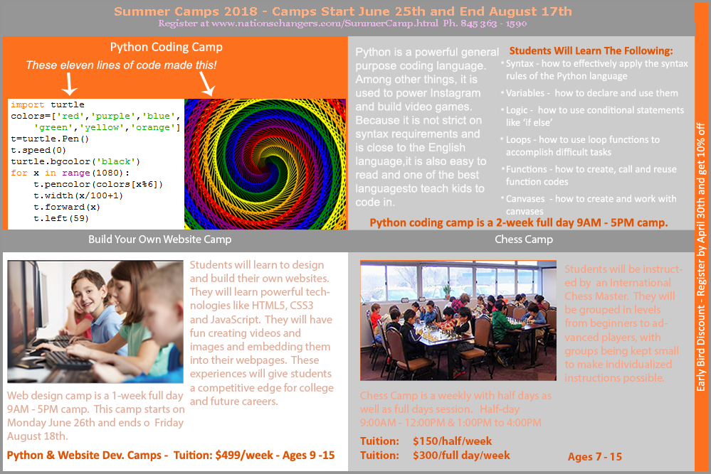 We are offering three camps this summer: Chess, Build Your own Website, and Python Game Development. The Chess Camp is weekly with morning and/or afternoon sessions. The computer camps are 2 weeks 9AM-5PM. Students may come as many weeks as they like. They will work on a different project each week. Please note also that early drop-off and late pick-up services are available.